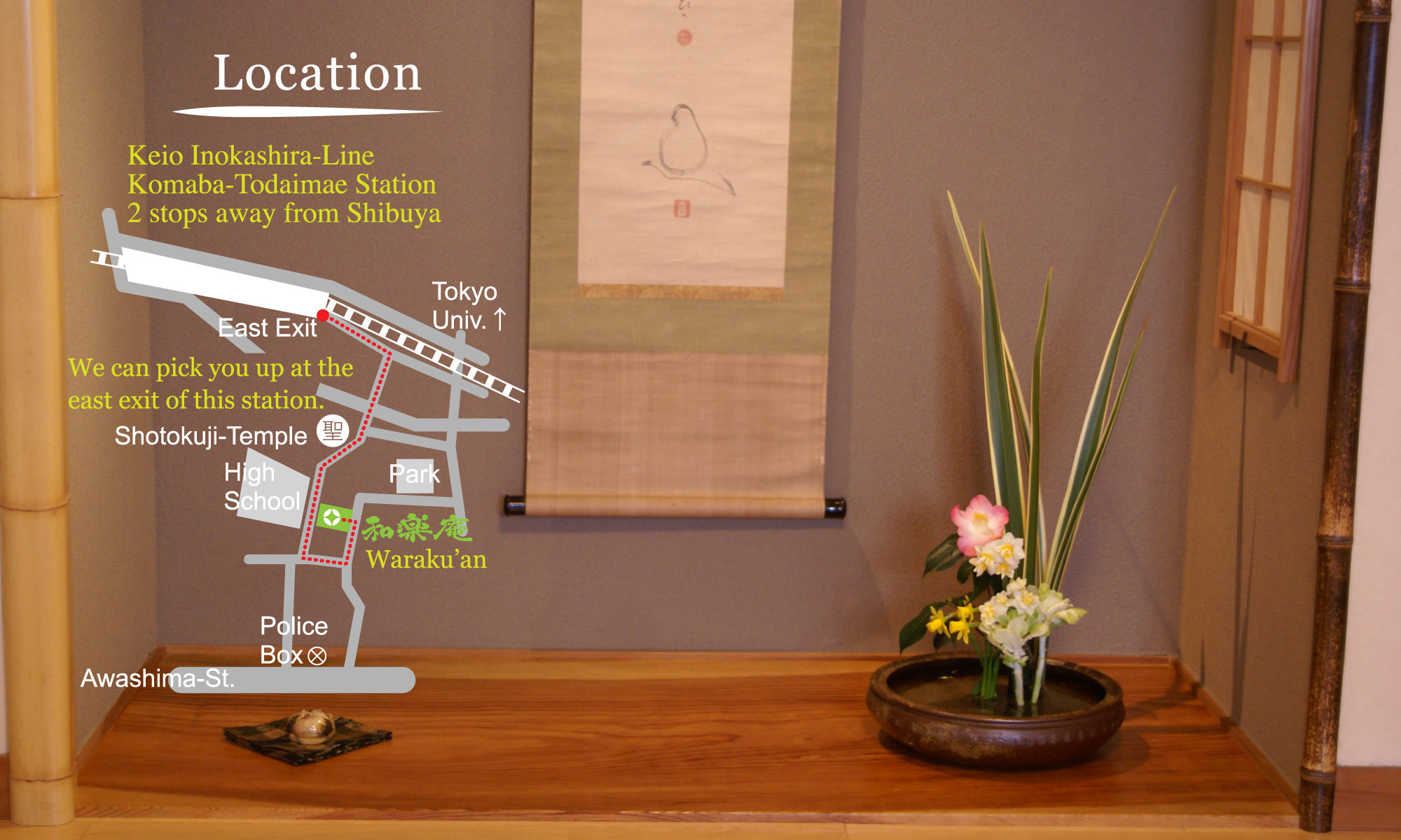 お抹茶を愉しむ駒場・和楽庵は、京王・井の頭線の駒場東大前駅から数分。渋谷から2駅とは思えない静かな住宅街にございます。渋谷からは、最後尾の車両にお乗りになるのがおすすめです。